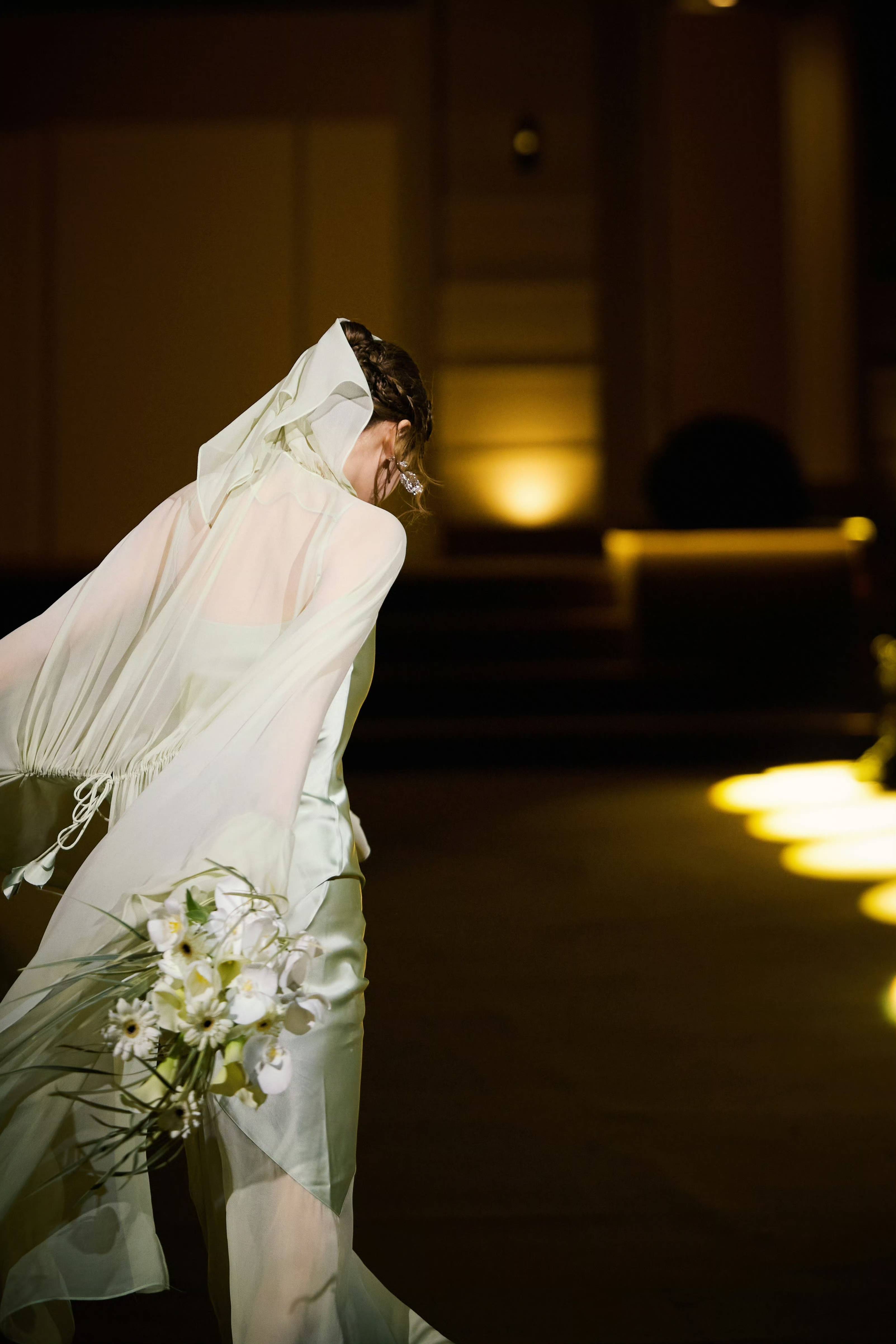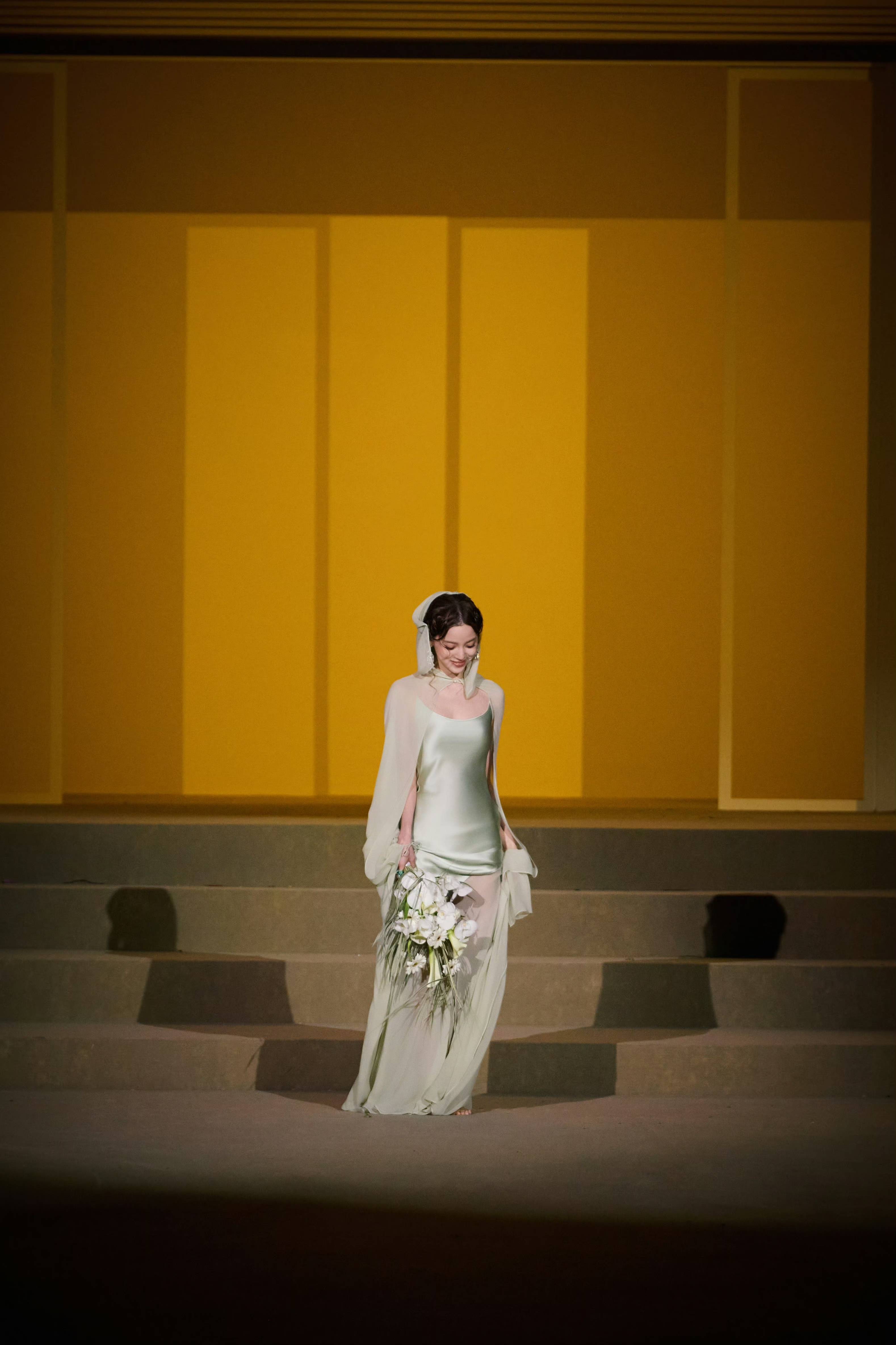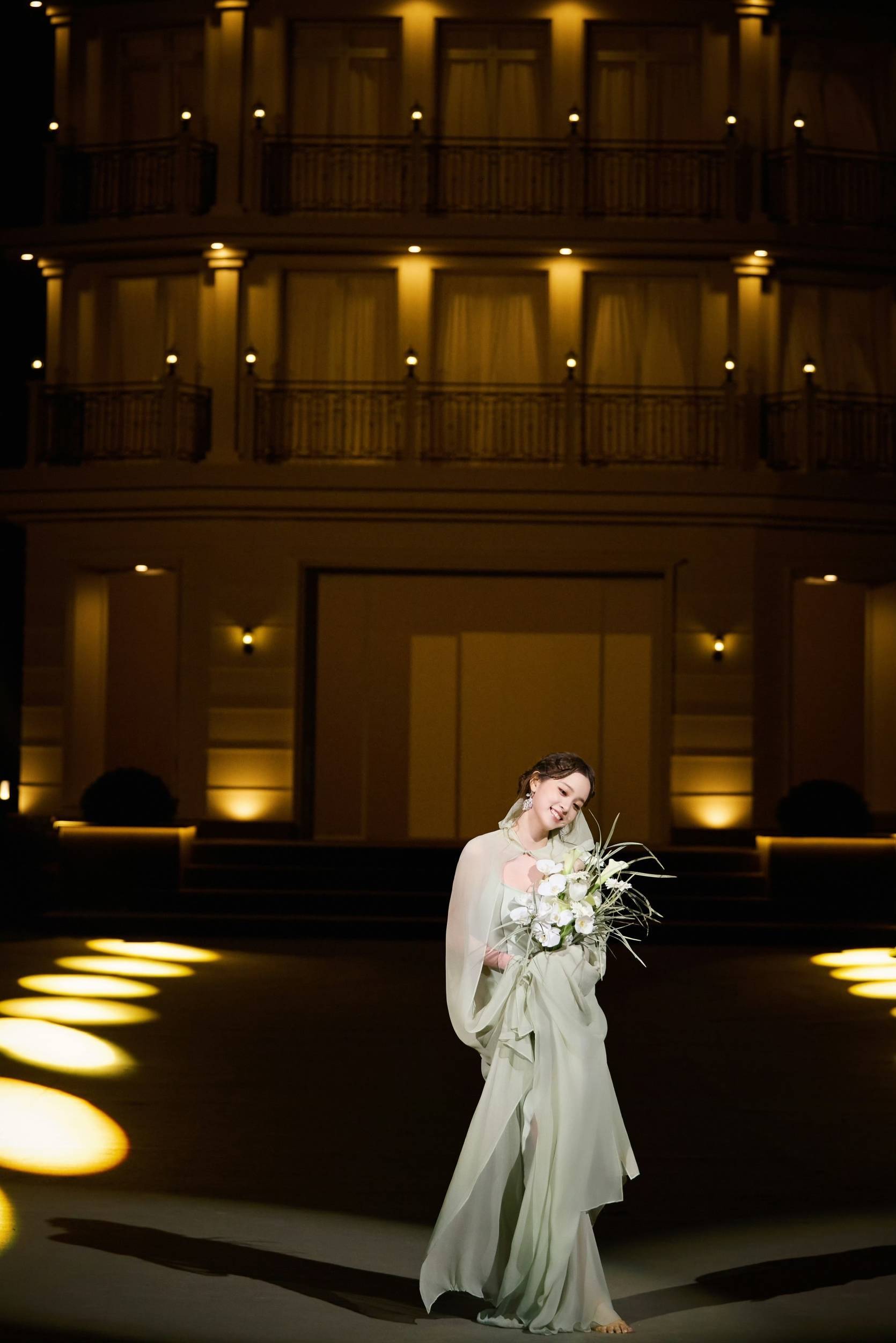薄荷绿纱裙在暖调光影中肆意飞扬,缎面与轻纱的碰撞将“优雅仪式感”与“随性自由感”融于一身,每一次裙摆的飘动都是对浪漫的生动诠释。